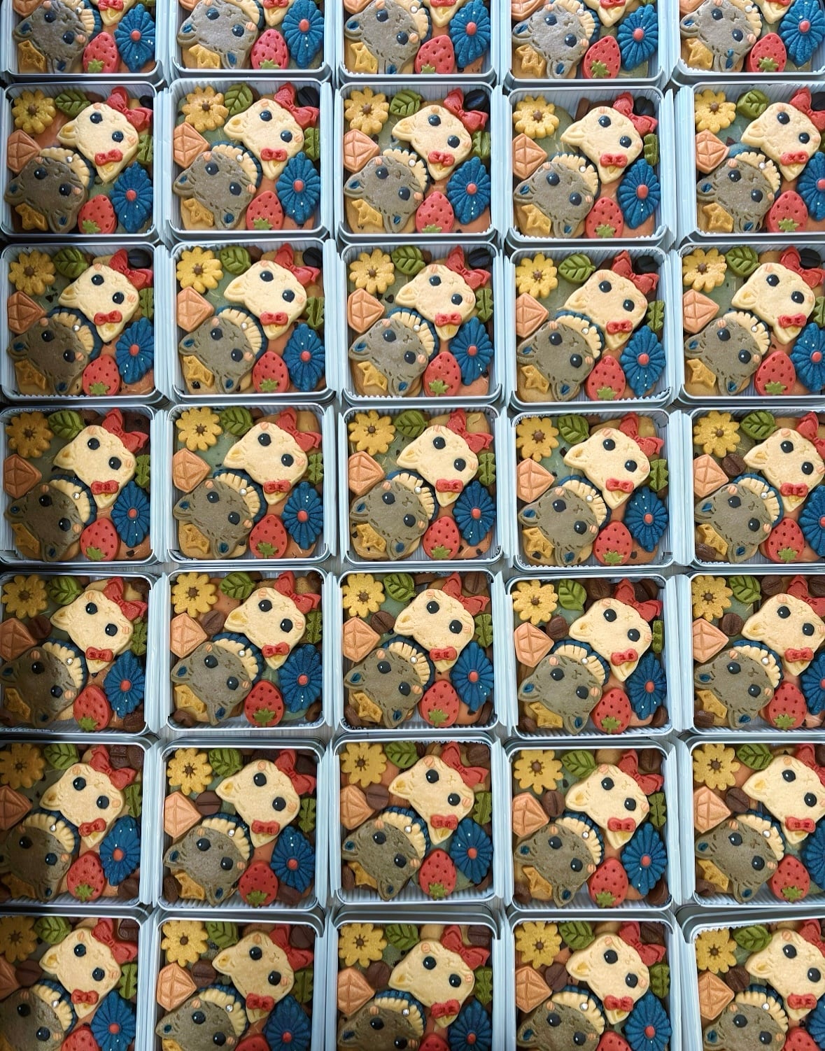 上段には、ティアラをつけた猫たちや、宝石、果実、花々などをかたどったアートのようなデザインクッキー。