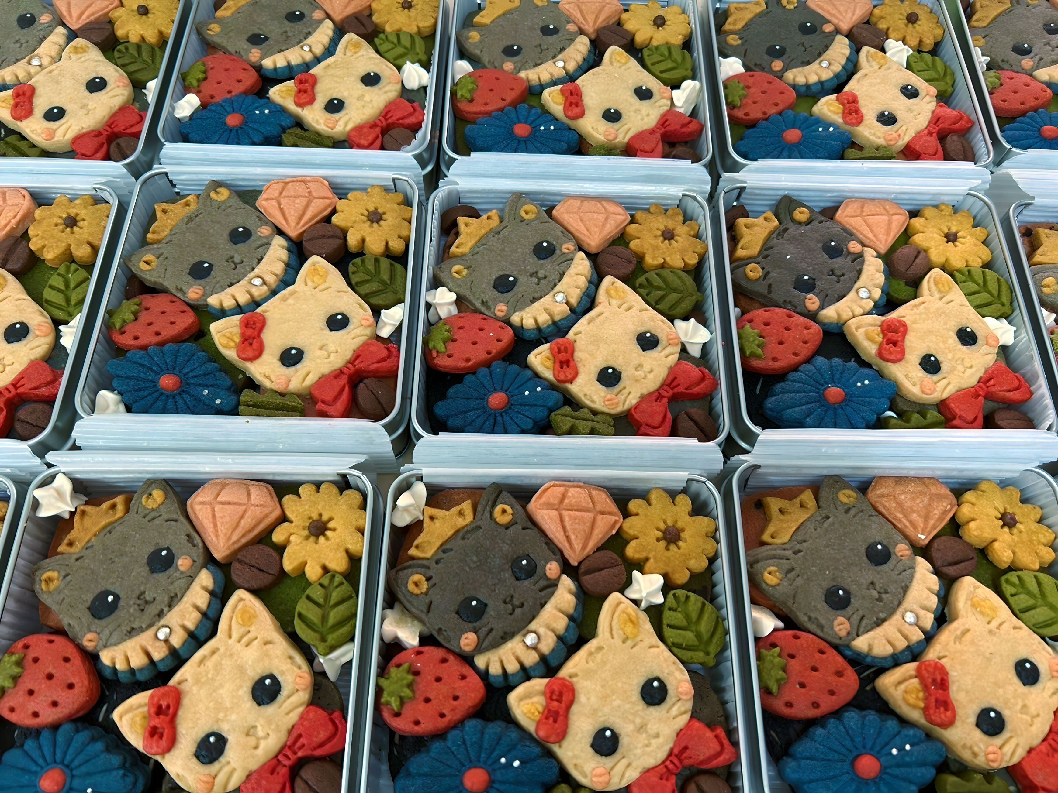 上段には、ティアラをつけた猫たちや、宝石、果実、花々などをかたどったアートのようなデザインクッキー。