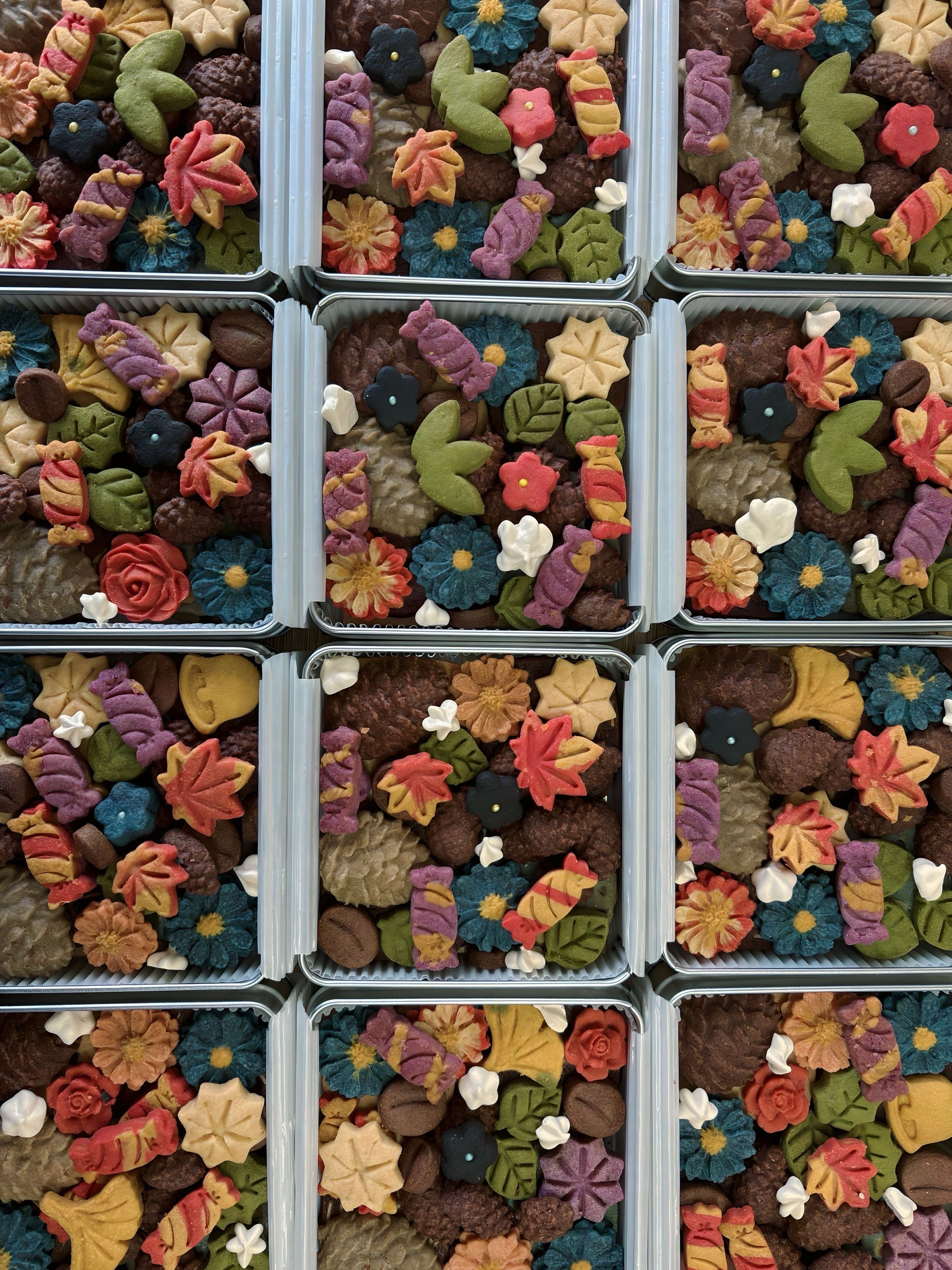 一般的なクッキーの焼き時間は10〜17分ほどですが、1番上のデザインクッキーは1時間以上じっくりと焼き上げています。