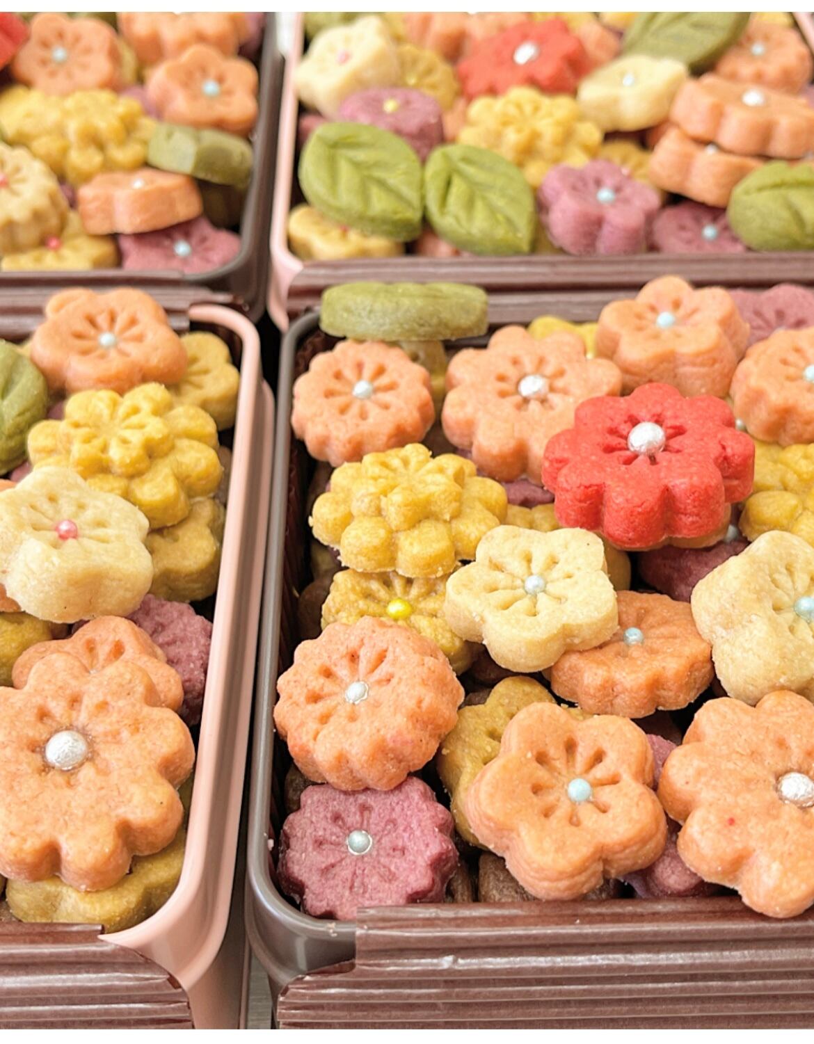 一般的なクッキーの焼き時間は10〜17分ほどですが、1番上のデザインクッキーは1時間以上かけてじっくりと焼き上げています。