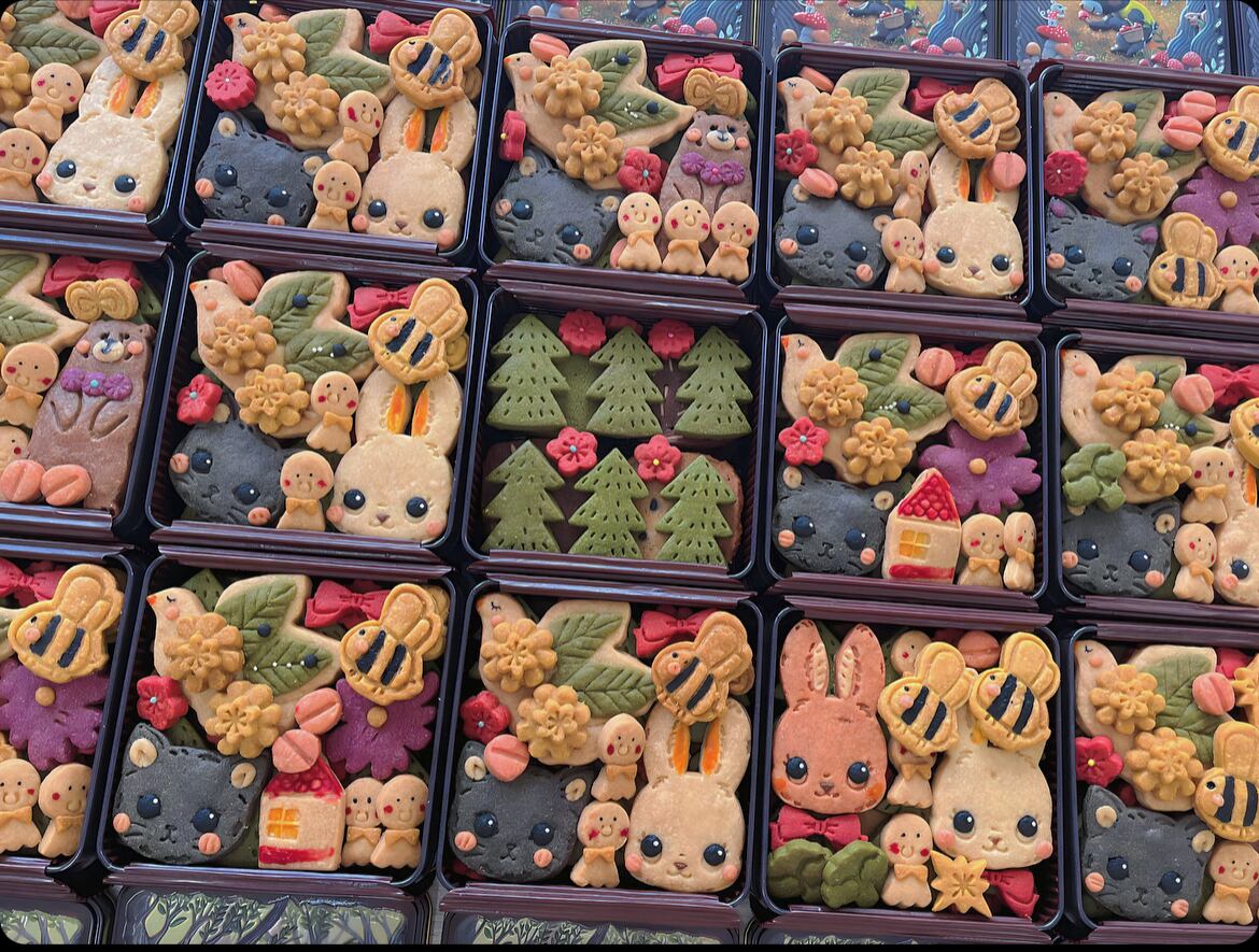 一般的なクッキーの焼き時間は10〜17分ほどですが、1番上のデザインクッキーは1時間以上じっくりと焼き上げています。